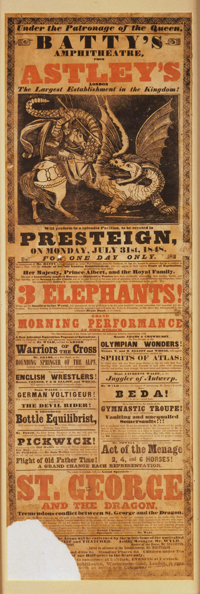For years now ,The Judge’s Lodging has displayed a Victorian circus poster, which always attracts much admiration. Advertising Batty’s Amphitheatre Show, performing in Presteigne on 31st July 1849, it boasts acrobats, animals, a re-enactment of St Geroge’s battle with the dragon amongst other spectaculars. But what is attracting attention now is the mention of three elephants, reported to be the smallest in the world.